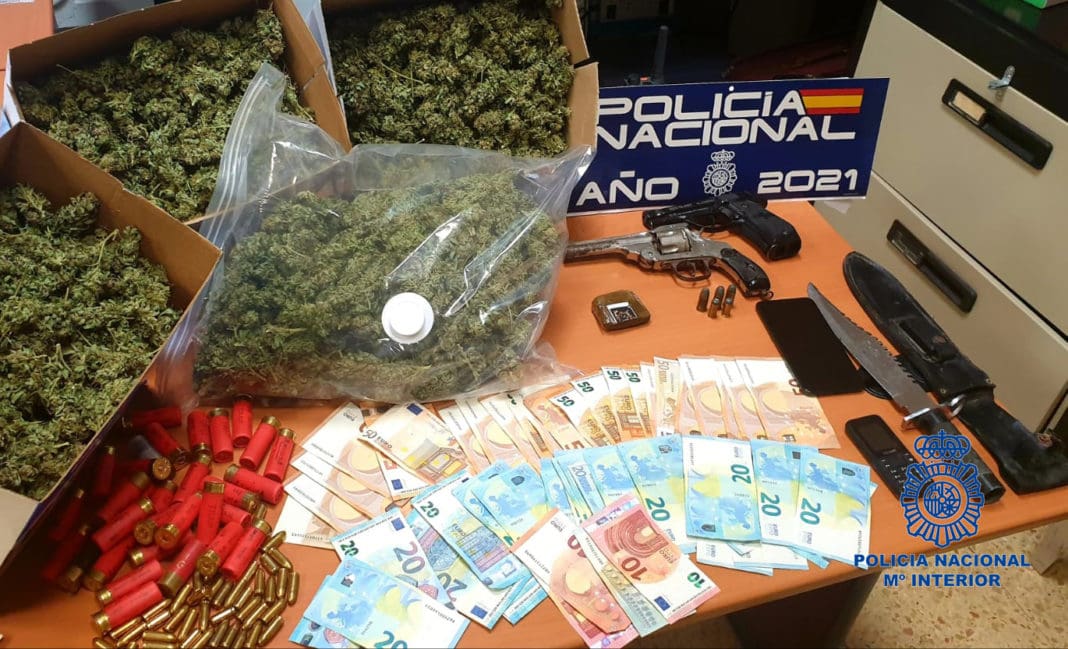 En total, los agentes han intervenido 38 gramos de heroína, unos 10 kilos de marihuana, 45 gramos de hachís, más de 4.000 euros, así como un revólver, una pistola de aire comprimido y un cuchillo de caza, entre otros efectos.