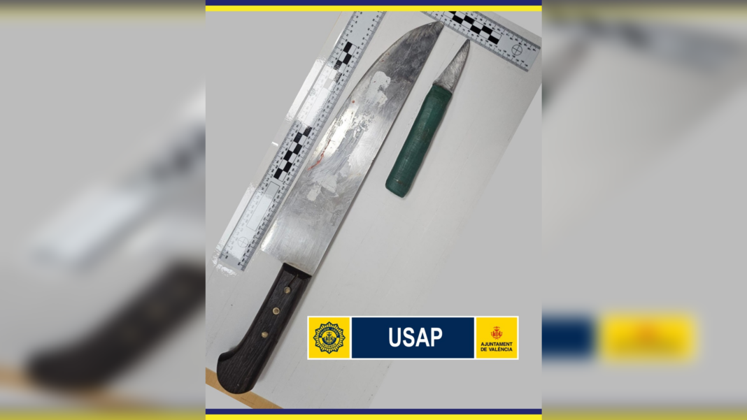 Durante la intervención, los agentes localizaron un cuchillo de aproximadamente 27,5 centímetros de hoja, con mango de madera y restos de sangre, oculto bajo un vehículo estacionado a pocos metros del lugar de la detención. Además, en el registro superficial del detenido se intervino un segundo cuchillo, de unos 6 centímetros de hoja y mango de plástico verde.