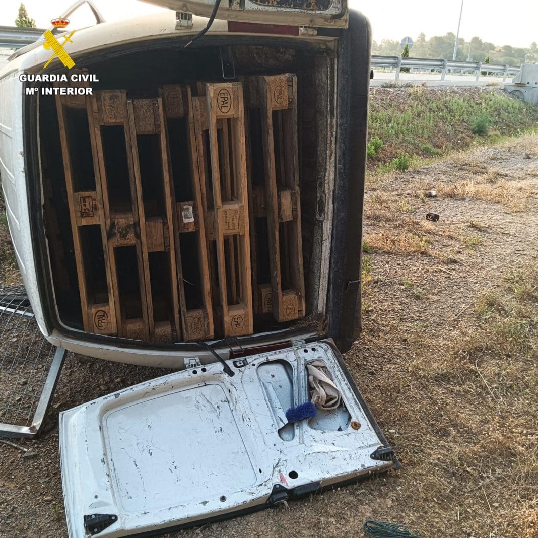 La Guardia Civil de La Pobla de Vallbona, en Valencia, ha detenido a un hombre que resultó herido tras saltarse un control rutinario con la furgoneta que conducía y volcar por robar 21 palés de una empresa y del que, posteriormente, se averiguó que tenía seis requisitorias judiciales de búsqueda y detención, cinco de ellas de ingreso en prisión.