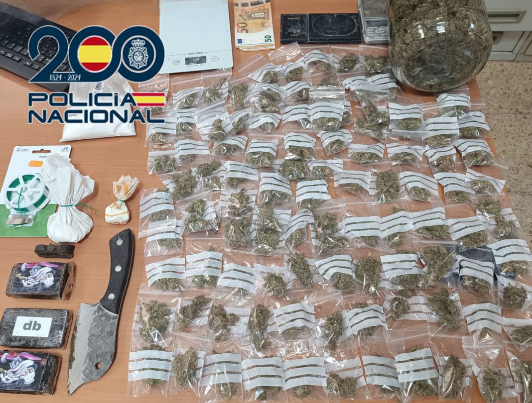Los agentes han registrado dos viviendas en las que se ha incautado 40 gramos de cocaína, casi 400 gramos de marihuana dividida en 169 dosis ya preparadas para su venta, 300 gramos de hachís, 126 gramos de sustancia de corte, dinero en efectivo, tres básculas de precisión y diversos útiles para la distribución y venta de la droga