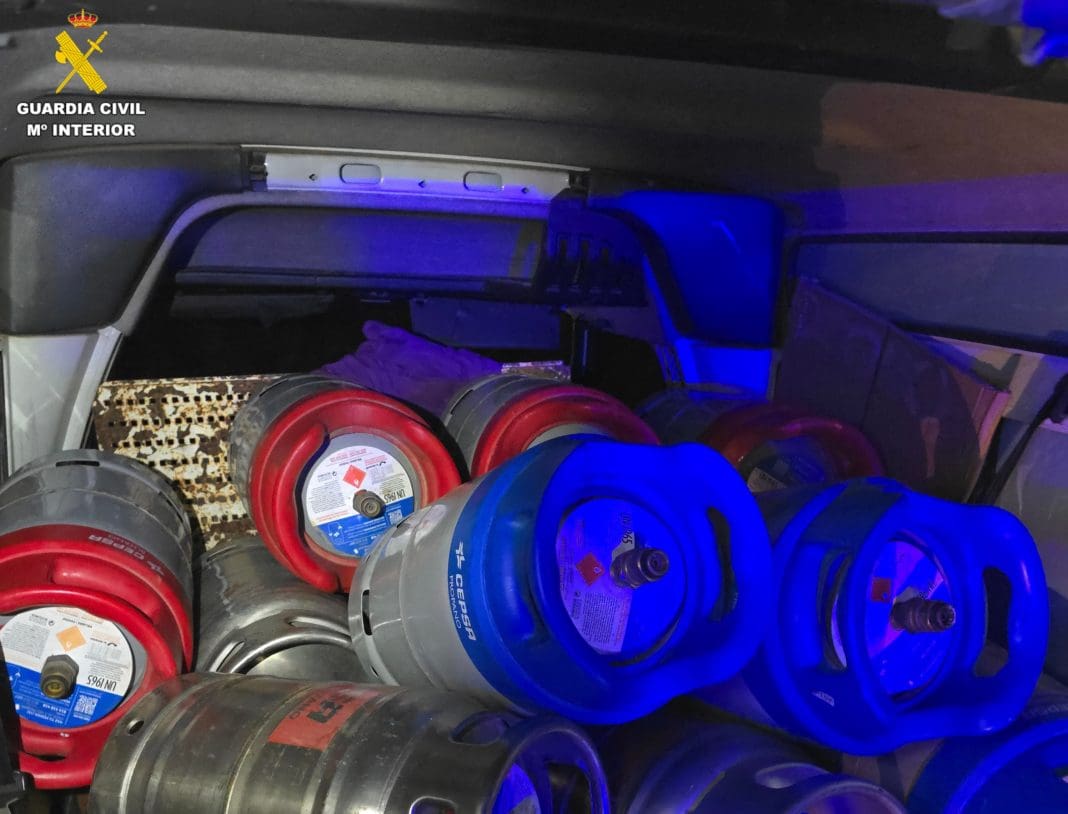 Los agentes de la Guardia Civil detectaron el pasado mes de abril la presencia de un vehículo que circulaba con las placas de matrícula tapadas para evitar su identificación. Al proceder a la identificación de los ocupantes del vehículo se pudo comprobar su carga, localizando varios candados fracturados, así como, un total de 18 bombonas de gas butano/propano en el interior de la furgoneta.
