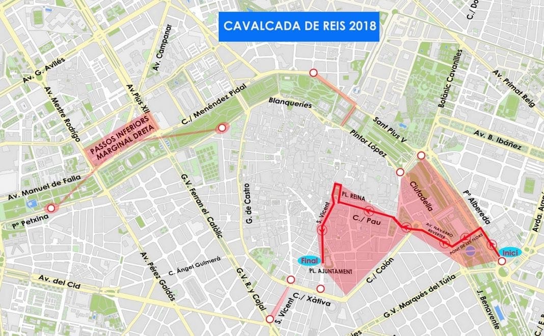 Finalment, durant el recorregut en si, es tancaran al trànsit els passos inferiors de la marginal dreta de l’antic llit del riu Túria (sentit plaça de Tetuan), el carrer Sant Vicent Màrtir des de la plaça d’Espanya, Marqués de Sotelo i l’accés al Pont de Fuet des del carrer Guadalaviar, així com els carrers i accessos per on transcorre la desfilada.