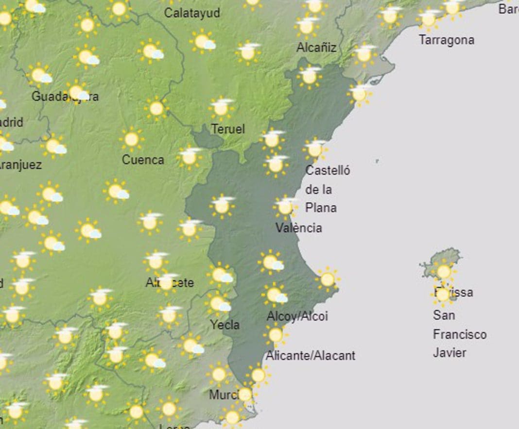 Finalmente, en Alicante, se esperan máximas de 20º en Orihuela, 19º en Dénia, Elx y Alcoi, y 18º en Alicante. Las mínimas serán de 7º en Elx y Orihuela, 8º en Alcoi y 9º en Dénia y Alicante.