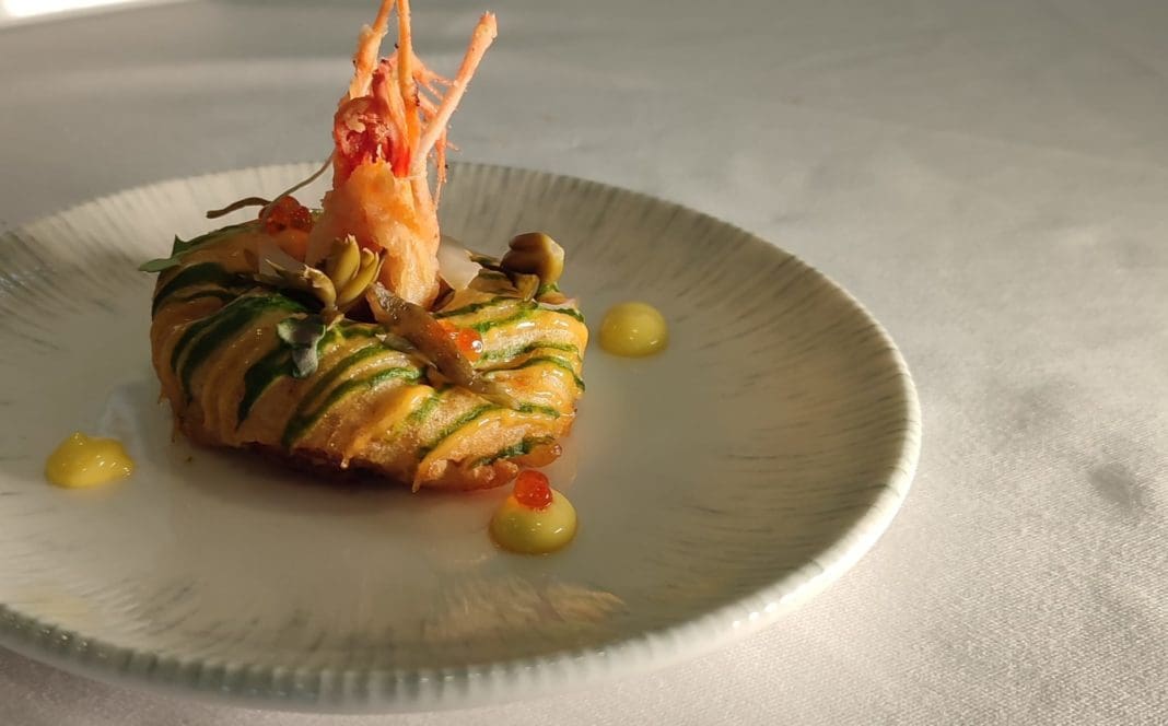 Un donut tipo buñuelo, relleno de cremoso de gamba roja y acelgas con mahonesa picante, emulsión de acelgas y encurtidos típicos de la marina alta del restaurante La Xerna del Mar de Denia, ha sido escogida como la Mejor Creación Autóctona del concurso Tapas d’Ací, que ha tenido lugar esta mañana en el CdT de València.