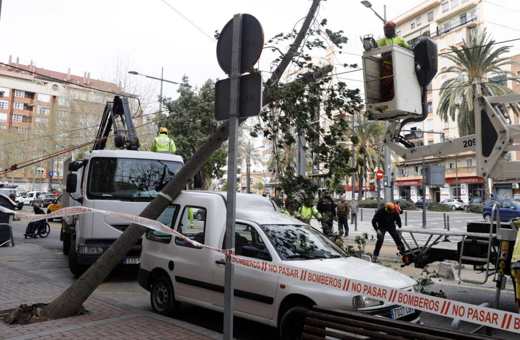 Fuentes municipales han informado que el árbol ha caído a la altura del número 10 de la calle San Vicente, en pleno centro de la ciudad, y los bomberos están trabajando en el lugar y un SVB ha trasladado a dos personas al Hospital General de València, en principio leves.