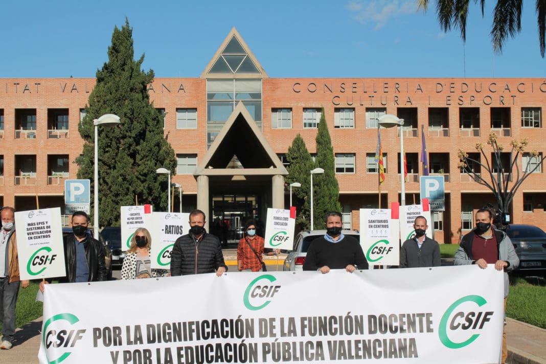 El sindicat CSIF ha desenvolupat este matí un acte de reivindicació davant la seu autonòmica de Conselleria d’Educació. La central sindical ha exigit més mesurades de prevenció a les aules, com a proveïment de màscares al professorat, filtres de reciclatge de l’aire en les classes o una disminució de ràtios d’alumnes per docent, per la qual cosa ha insistit en la contractació de més personal.