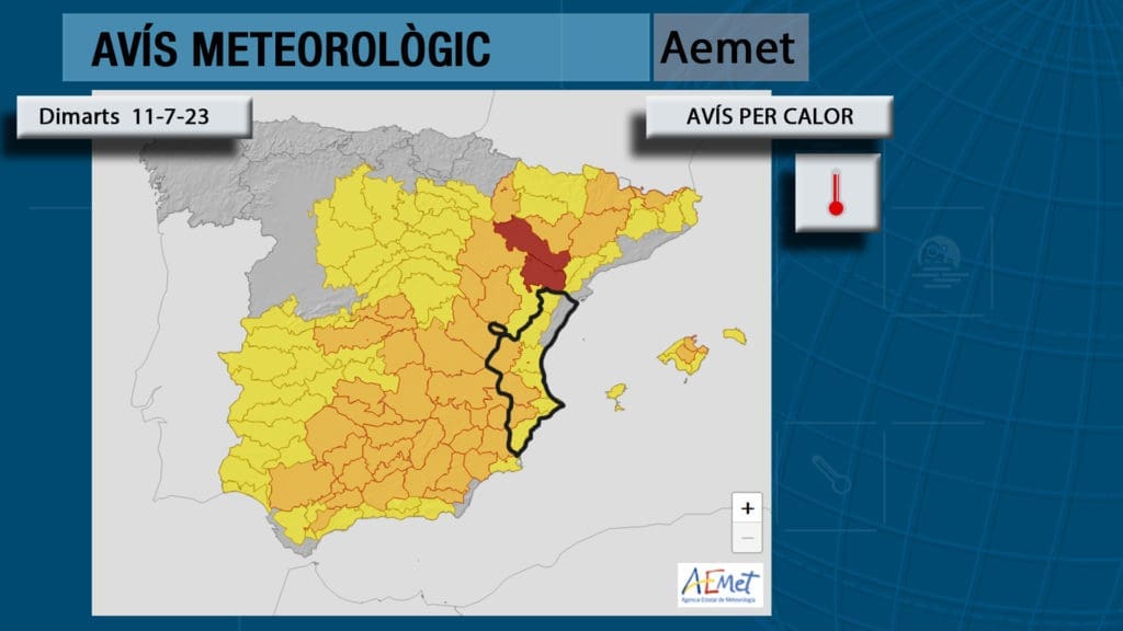 Ayer notamos cómo iba consolidándose la masa de aire cálida responsable de la segunda ola de calor del verano y de los avisos meteorológicos que hoy ha decretado Aemet para buena parte de la Península y de la Comunitat Valenciana donde solo se libran las olas más costeras de Castellón.