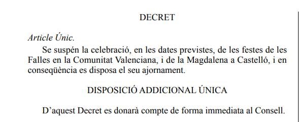 El DOGV ha publicat este matí el decret pel qual se suspén i s’ajorna la celebració de les festes de les Falles en la Comunitat Valenciana, i de la Magdalena a Castelló.