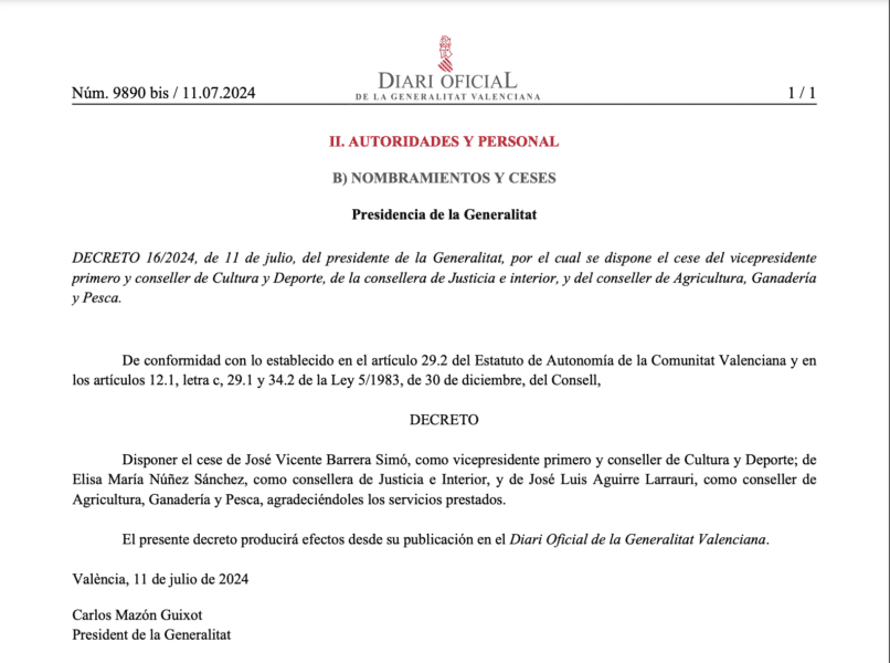 El Diari Oficial de la Generalitat Valenciana (DOGV) ha publicado a última hora de este jueves un decreto por el que el jefe del Consell, Carlos Mazón, dispone el cese del vicepresidente primero y conseller de Cultura y Deporte, Vicente Barrera; de la consellera de Justicia e Interior, Elisa Núñez y del conseller de Agricultura, Ganadería y Pesca, José Luis Aguirre, a quienes agradece los servicios prestados.