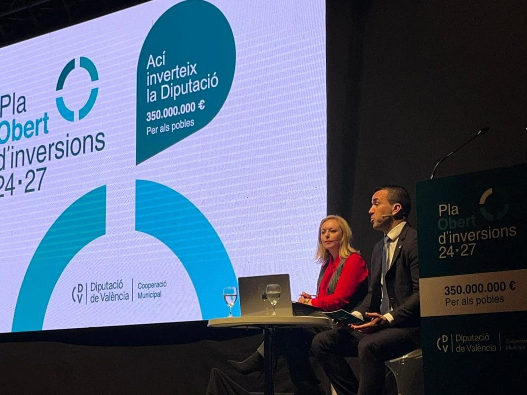 El presidente de la Diputació de València, Vicent Mompó, y la vicepresidenta primera y responsable de Cooperación Municipal, Natàlia Enguix, han dado a conocer este lunes el Pla Obert d’Inversions para el período 2024-2027, el programa inversor de la institución provincial que pasará a ser plurianual, más flexible y ágil en burocracia y que crecerá hasta los 350 millones de euros, un 20% más que la pasada legislatura cuando se dotaron de 288 millones el proyecto, pero también incluye las ayudas del ciclo integral del agua, el plan Reacciona y la energía.