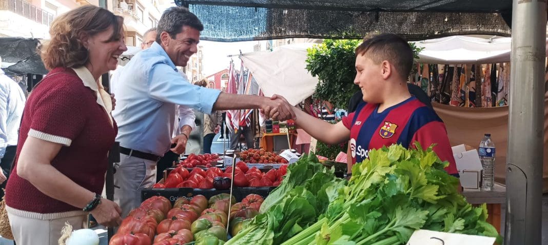 El President de la Generalitat, Carlos Mazón, ha sido recibido esta mañana de sábado por la alcaldesa María Gómez, quien ha visitado el Mercado Semanal de Almoradí, un evento declarado de Interés Turístico Provincial y que cuenta con más de cuatro siglos de historia.