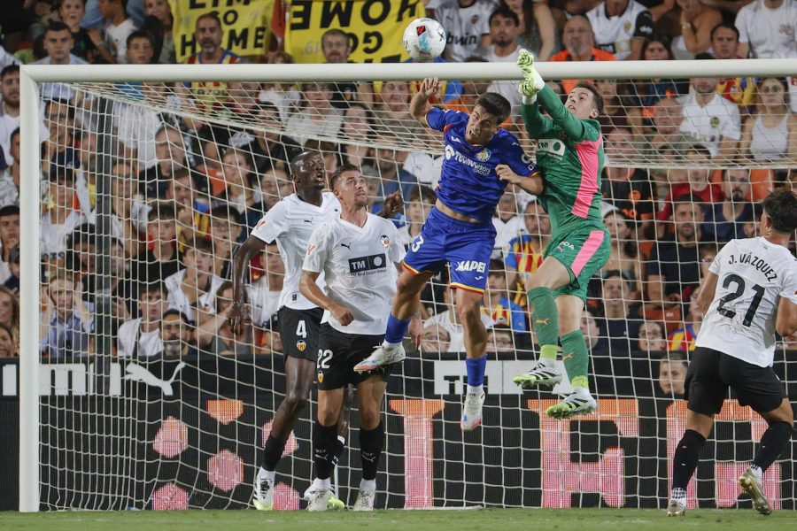 El portero del Valencia Julen Agirrezabala (2d) despeja un ataque durante el partido de la tercera jornada de LaLiga que Valencia CF y Getafe CF disputan este viernes en el estadio de Mestalla. EFE/Manuel Bruque