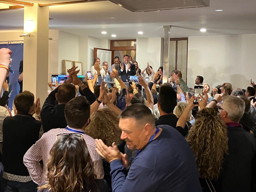 El nuevo alcalde de Alicante, Luis Barcala ha aparecido en la sala del restaurante donde le esperaba la familia del Partido Popular al grito de «alcalde, alcalde», «campeones» y «que vote el alcalde».