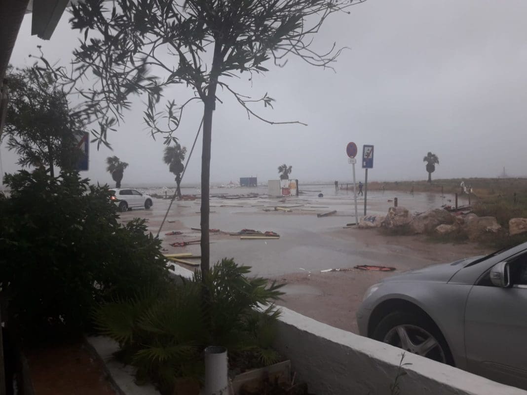 De fet, el poliesportiu municipal s’ha vist afectat per la caiguda d’un mur i de part del sostre i una paret. De moment, es mantenen tallades al trànsit rodat els carrers Assagador de la Marjal, camí del Llavador, Melva, camí Vell de Gandia, camí Fons, La Xara, Marineta Cassiana, carrer Bot i plaça Benidorm.