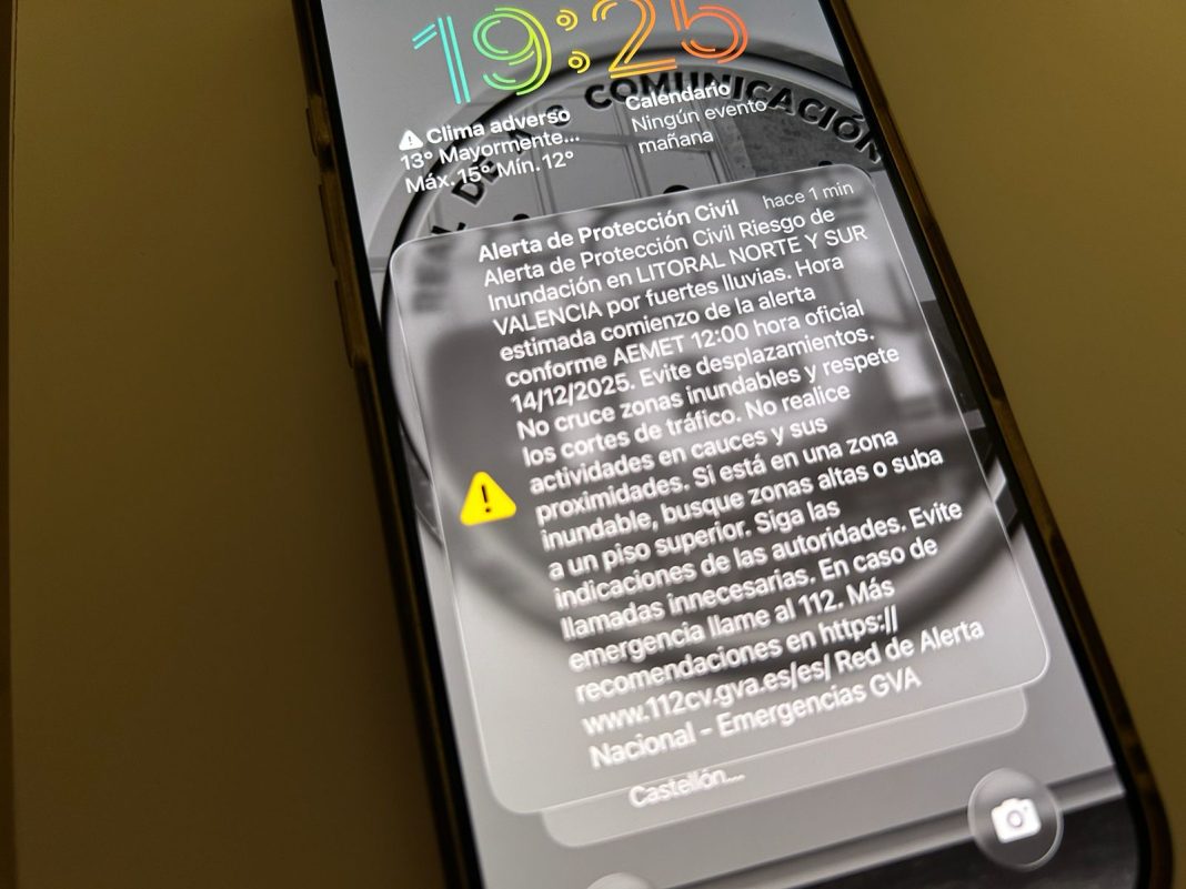 Emergencias de la Generalitat Valenciana ha enviado hace apenas unos minutos un mensaje Es-Alert a los teléfonos móviles alertando de riesgo de inundación en el litoral norte y sur de Valencia por fuertes lluvias. En el aviso, Protección Civil informa de que la hora estimada de comienzo de la alerta es a las 12:00, “conforme AEMET”, y sitúa el episodio en la jornada del 14/12/2025.