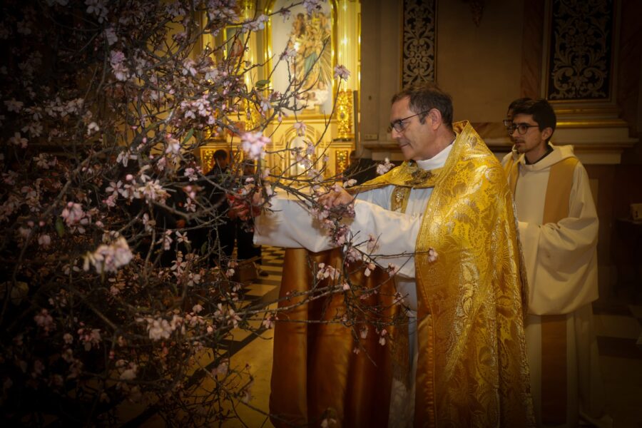 El recorrido finalizó en la Parroquia de la Asunción de Nuestra Señora, donde el párroco D. Jesús Corbí bendijo la rama de almendro. Esta fue ofrecida a la Virgen del Rosario, en uno de los momentos más emotivos de la celebración.