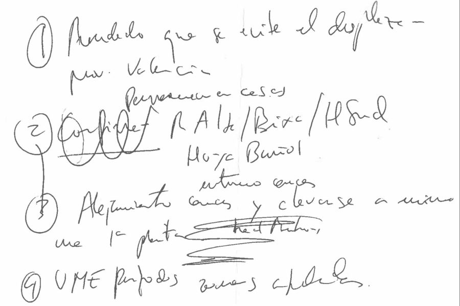 En las notas de Pradas se lee en primer lugar la recomendación de que ‘se evite el desplazamiento‘ en la provincia de Valencia. En un segundo punto, aparece tachada la palabra ‘confinamiento‘ y, sobre ella, la instrucción ‘permanecer en casas‘, acompañada de la mención a cuatro comarcas: Ribera Alta, Ribera Baixa, Horta Sud y Hoya de Buñol. Ese cambio sugiere que el órgano consideró fórmulas más restrictivas y acabó optando por una pauta de refugio domiciliario focalizada en las zonas con mayor exposición prevista.