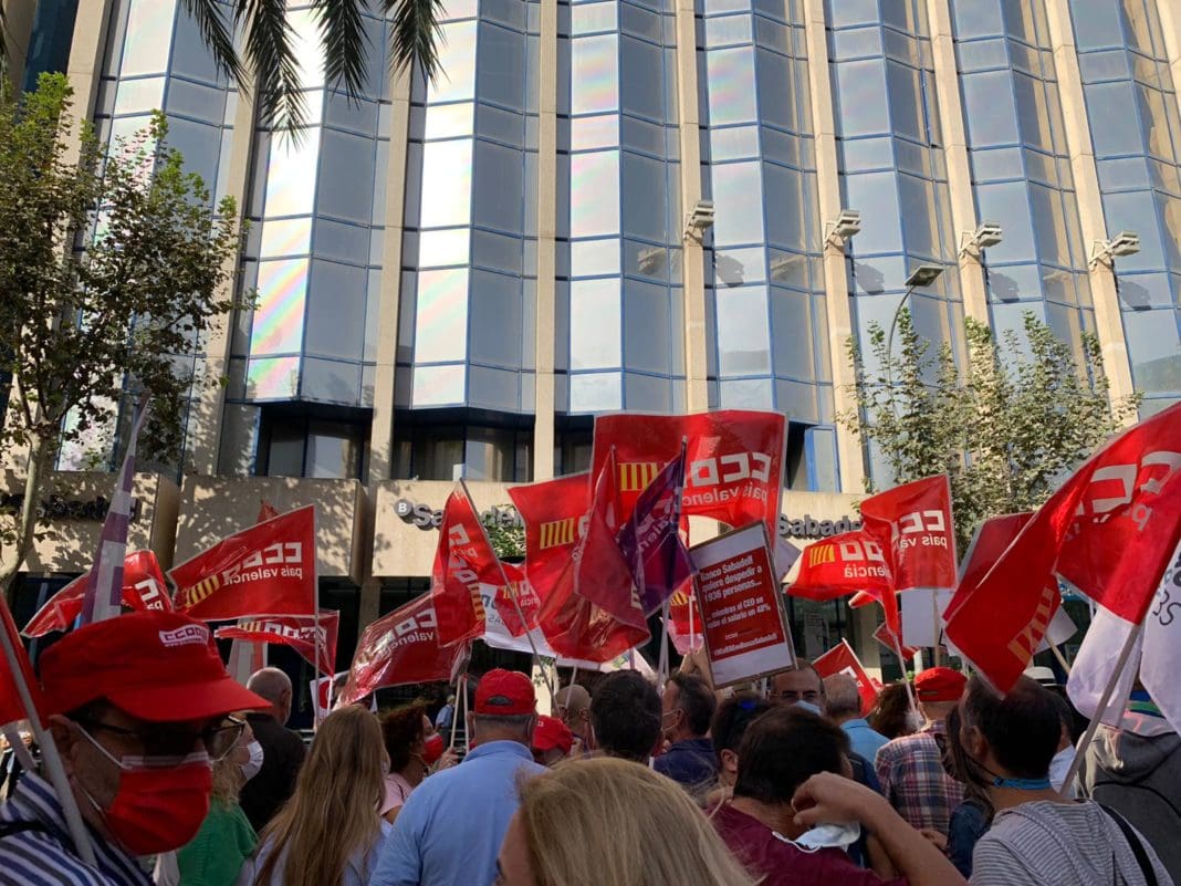 Los trabajadores y trabajadoras del Banco Sabadell se han concentrado esta mañana ocho ciudades, entre ellas Alicante, contra el ERE que supondría el despido de 1.936 trabajadores y el cierre de 496 oficinas.