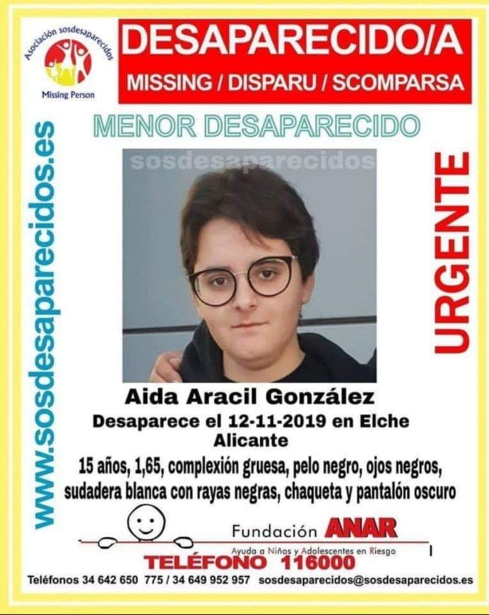 Aída Aracil González té 15 anys, mesura 1,65, té els cabells negres, els ulls foscos i en el moment de la desaparició vestia amb uns pantalons foscos, una dessuadora a ratlles i portava una jaqueta.