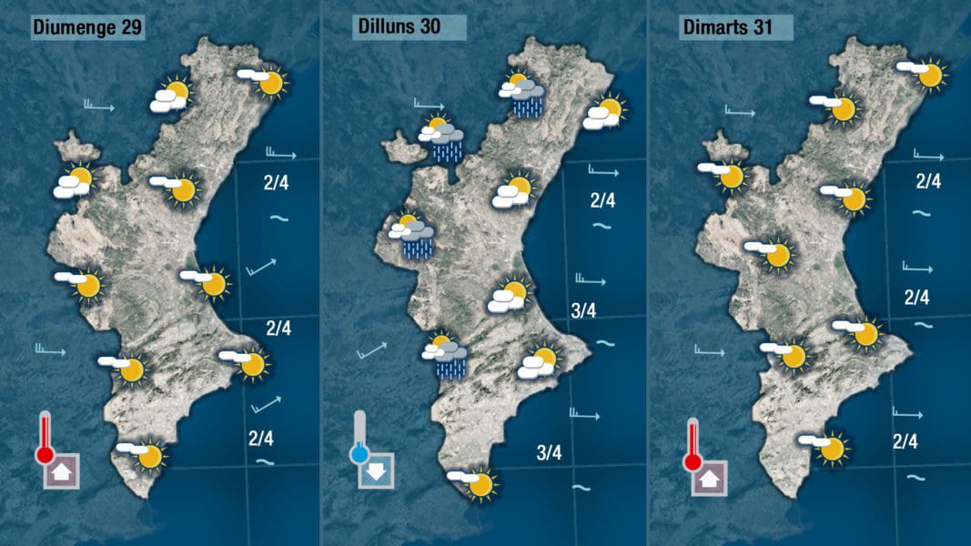 Tampoco espero cambios ni para domingo ni para los últimos días de octubre que también irán de la mano del poniente. Solo el paso de un frente la tarde-noche de lunes podrán dejar chubascos débiles por el interior. Los últimos de un octubre cálido y muy seco.