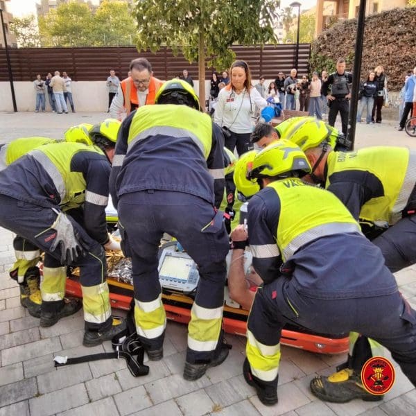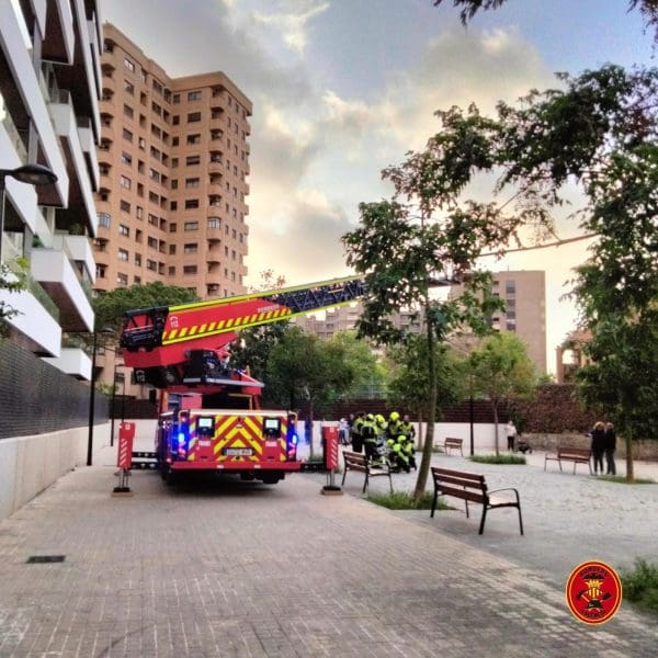 Efectivos del Departamento de Bomberos del Ayuntamiento de València realizaron una evacuación por parada cardiorrespiratoria este jueves por la tarde a una persona desde la undécima planta de un edificio de la ciudad, en un complejo dispositivo de salvamento.