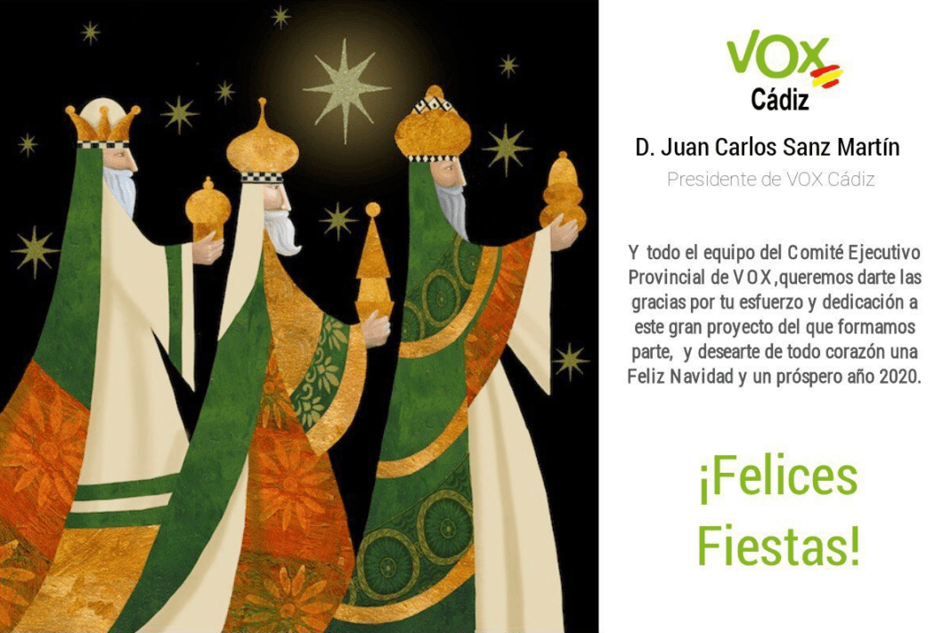 «Es van fer un parell de dissenys internament i s’ha filtrat el que no havíem triat. No és la felicitació oficial» ha explicat a aquest periòdic Juan Carlos Sanz, president de Vox a Cádiz, i apuntava que «La nostra felicitació triada és un Betlem amb un portalet. Vaig descartar la dels Reis perquè em semblava molt trist».