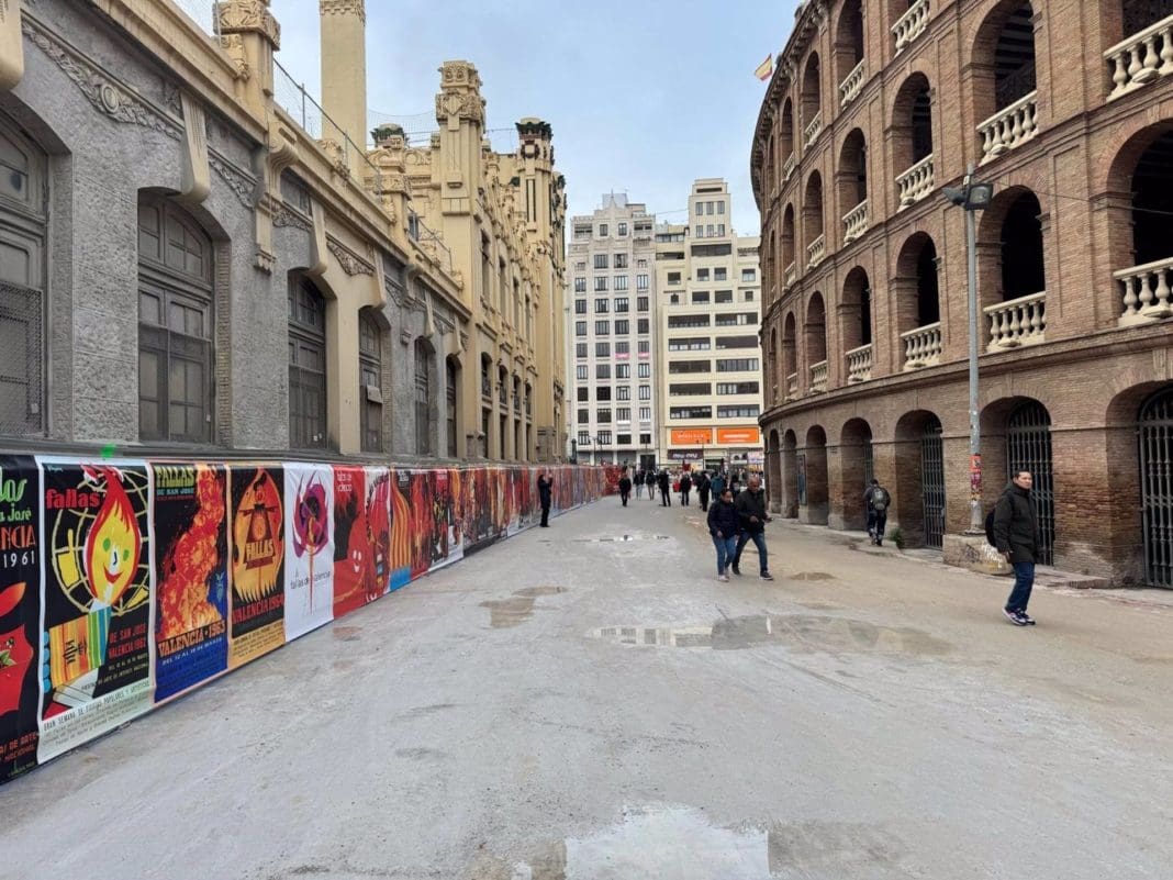 Este año las imágenes seleccionadas para cubrir el cerramiento que impide el paso a la zona de obra son una composición de los carteles oficiales de Fallas, desde 1929 a 2024, que se exponen a gran tamaño, a lo largo de cerca de 150 metros.