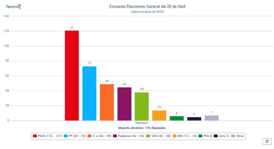 El PSOE guanyaria les eleccions generals d’avui amb un màxim de 121 escons i el PP baixaria a 73 diputats, segons una enquesta de GAD3, que concedeix a Ciutadans 49 escons com a molt, a Unides Podem 45 representants i vaticina que Vox entrarà en el Congrés amb 38 escons.