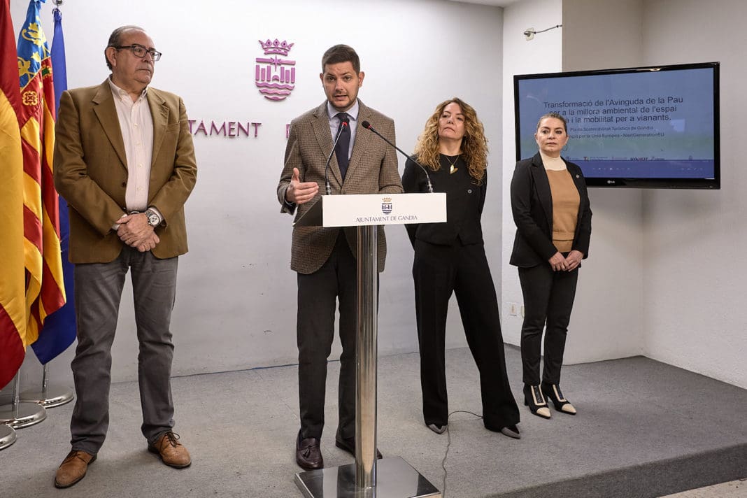 El alcalde de Gandia, José Manuel Prieto, acompañado por la Coordinadora General de Urbanismo, Maite Alonso; el presidente de la Junta de Distrito del Grau, Miguel Ángel Picornell, y la regidora de Economía, Elena Moncho, ha anunciado hoy el inicio de las obras de humanización y renovación urbana de la avenida de la Pau. Este proyecto, enmarcado dentro del tercer Plan de Sostenibilidad Turística (2023-2025) y financiado íntegramente con fondos europeos Next Generation, supondrá una inversión de 630.236 euros.