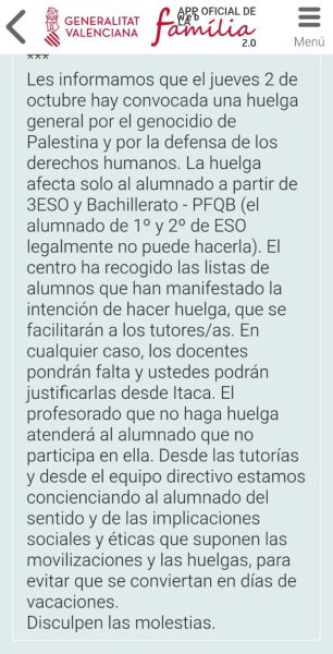 El mensaje enviado desde la Generalitat Valenciana a las familias del alumnado de 3 de la ESO, bachillerato y Formación Profesional señala también que «desde las tutorías y desde el equipo directivo estamos concienciando al alumnado del sentido y de las implicaciones sociales y éticas que suponen las movilizaciones y las huelgas para evitar que se conviertan en días de vacaciones. Disculpen las molestias».