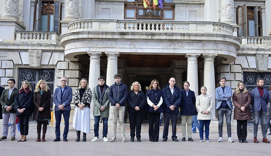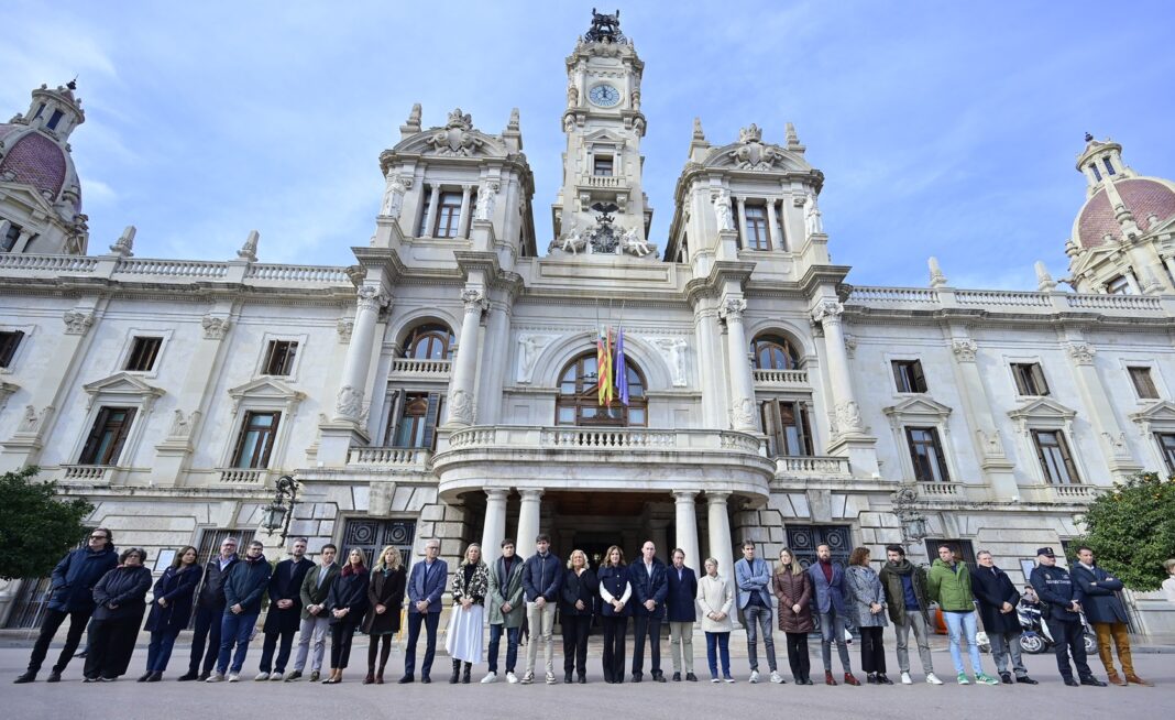 La corporación municipal, encabezada por la alcaldesa María José Catalá, ha participado en este gesto de recuerdo junto a personal municipal y ciudadanos que se han sumado de manera espontánea, mientras el resto de edificios municipales también se adherían al luto.