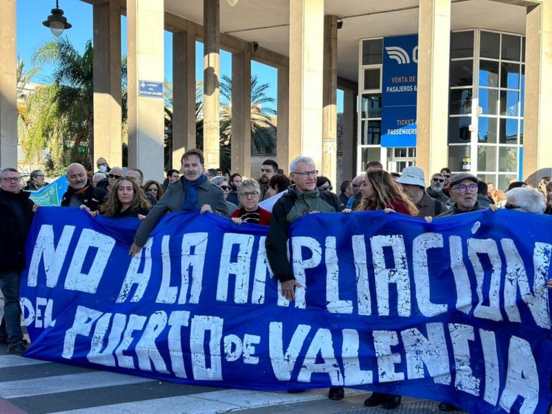 No somos el Puerto de Madrid” o ‘No, no, no, no a la ampliación”, son algunas de las proclamas que se han podido escuchar esta mañana en la protesta convocada por la Comissió Ciutat-Port para expresar su rechazo a la ampliación de esta infraestructura marítima. Una concentración en la que también han participado dirigentes de Compromís como el exalcalde de València, Joan Ribó; la portavoz de Compromís, Papi Robles; o el portavoz de la formación en Les Corts, Joan Baldoví.