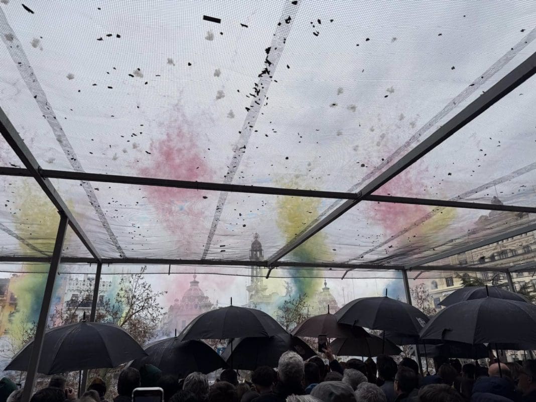 La ‘mascletà’ ha dado comienzo, como es tradicional, a las 14.00 horas y después de que las falleras mayores de València, Berta Peiró y Lucía García, protegidas con paraguas, han dado la orden al pirotécnico con la tradicional frase ‘Senyor pirotècnic, pot començar la mascletà’.