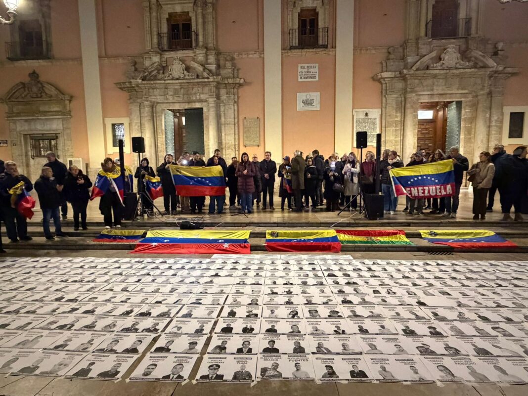 Valencia ha acogido un homenaje simbólico a los presos políticos venezolanos en la Plaza de la Virgen, donde se exhibieron los rostros de cerca de 600 personas que continúan detenidas en cárceles y centros de tortura del país.