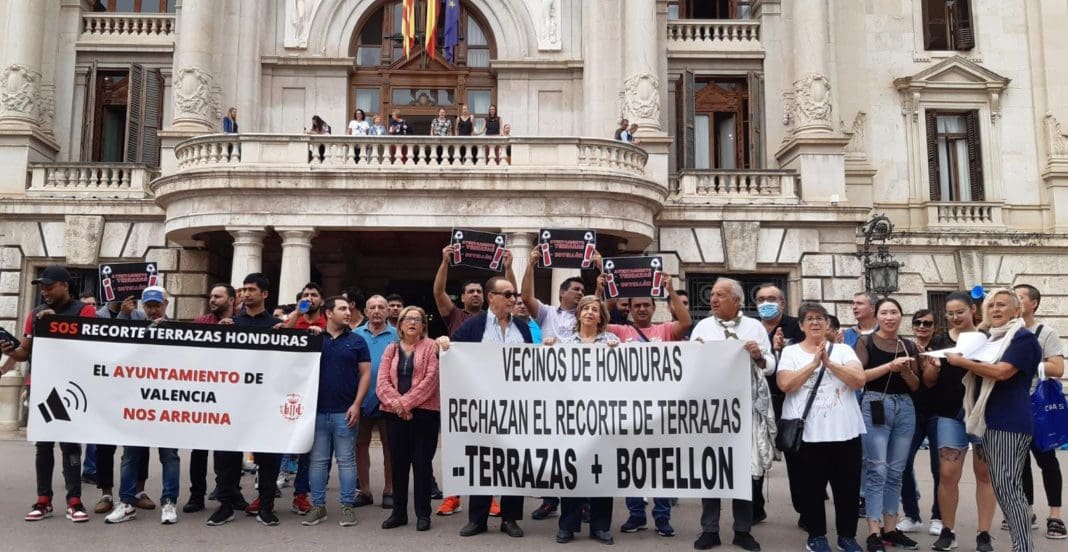 Hosteleros y vecinos del barrio de Honduras y Blasco Ibáñez se han vuelto a concentrar esta mañana ante el balcón del edificio del Ayuntamiento de València para reclamar la suspensión inmediata del plan especial de recortes de terrazas de la zona y un plan de medidas para acabar con las molestias vecinales y la falta de seguridad en la zona.