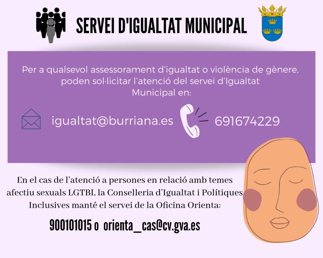 L’Ajuntament de Borriana informa la ciutadania que per a qualsevol assessorament en relació a temes d’igualtat o violència de gènere, poden sol·licitar l’atenció del servei d’Igualtat Municipal a través del correu igualtat@burriana.es, o el telèfon 691674229. També, per a revisió de Plans d’Igualtat i atenció a la ciutadania a la qual només s’atendrà amb cita prèvia.