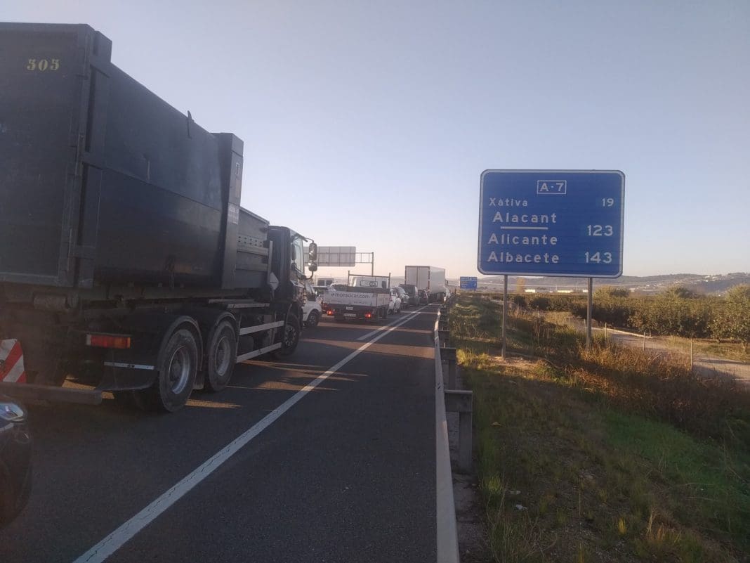 Un atasco de más de 10 km está afectando la A-7 con retenciones de vehículos tras el incendio de un camión cargado de pintura y disolvente en Alberic.