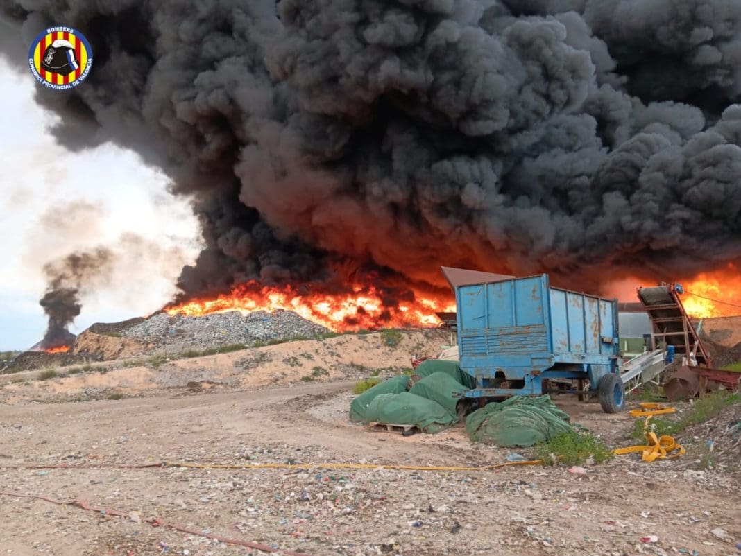 Los bomberos trabajan en un incendio que afecta una planta de reciclaje de Requena