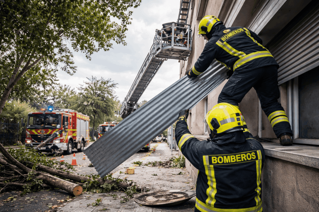 Los servicios realizados han consistido principalmente en la retirada de planchas metálicas y canaletas desprendidas por el viento. En menor medida, también se ha actuado sobre árboles que presentaban riesgo de caída, con el objetivo de garantizar la seguridad en espacios públicos.