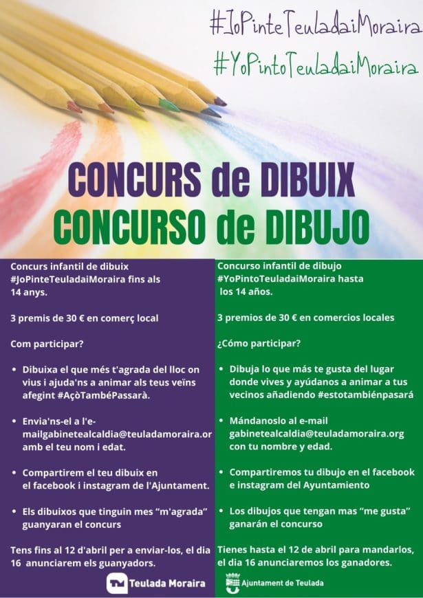 L’Ajuntament de Teulada Moraira ha organitzat un concurs infantil de dibuix amb el lema #jopintoTeuladaiMoraira perquè els més xicotets puguen mostrar el que més els agrada del lloc on viuen. A més, podran animar als seus veïns afegint el lema #açòtambépassarà.