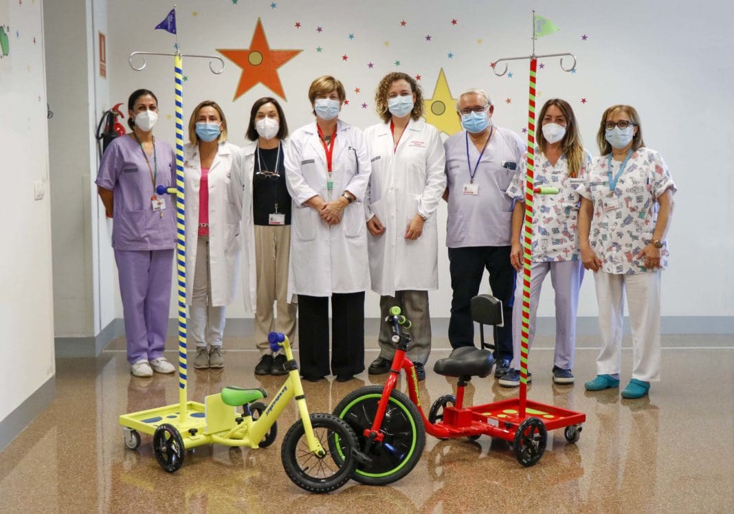 La Fundación Juegaterapia ha donado dos kiciclos de dos tamaños diferentes, con el fin de que menores ingresados en el Área de Pediatría del Hospital La Fe puedan pasear por los interiores, siempre que tengan permiso clínico. El triciclo lleva un remolque para el gotero y da libertad de movimientos, siempre que se encuentren bien y no les estén suministrando medicación.