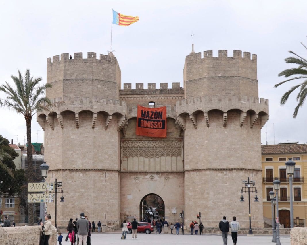 Joves PV-Compromís han descolgado una bandera de 6x6m donde se podía leer «Mazón dimisión«. Esta acción llega pocos días después de que las versiones del Presidente de la Generalitat Valenciana sobre su llegada al CECOPI no paren de cambiar y la presión sobre Carlos Mazón aumenta.