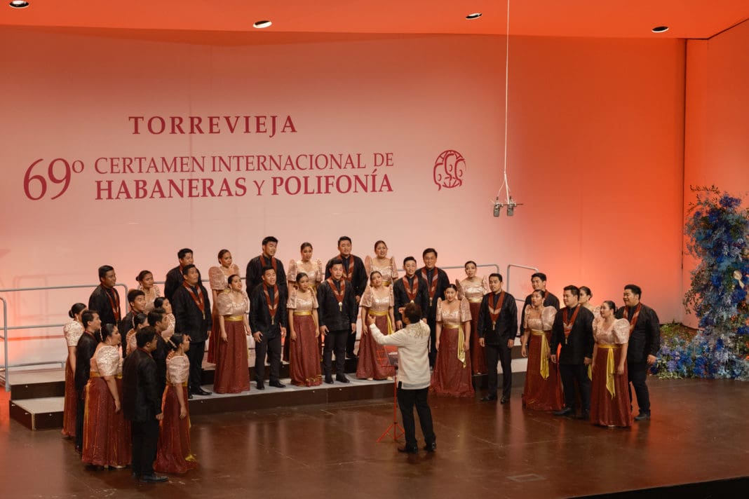 El coro filipino ‘Kammerchor Manila’ se ha proclamado triunfador absoluto en el 69º Certamen Internacional de Habaneras y Polifonía de Torrevieja al conseguir los principales premios del palmarés, entre ellos el primero de habaneras “Ricardo Lafuente”, pero también el primero de polifonía “Juan Aparicio” y el que concede la Excma. Diputación Provincial de Alicante a la agrupación coral que logra la mayor puntuación global. En total 32.000 euros, a los que hay que sumar el premio a la mejor dirección “José Hódar Talavera”, dotado con trofeo, para su director, Anthony Go Villanueva, quien fue el encargado de dirigir la interpretación conjunta a cargo de alrededor de 300 coralistas de “Sal de mi vida”, la habanera que ha sido obligada de esta edición con letra y música del Victor Daniel Lozada.