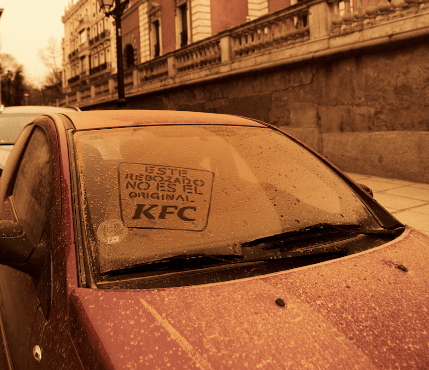 Ayer, toda España amaneció cubierta por una gran capa de calima procedente del desierto del Sahara que rebozó las calles y los coches y KFC aprovechó esta circunstancia para lanzar una promoción basada puramente en la actualidad, utilizando los coches de los particulares como un canal de comunicación propio, convirtiéndolos en la imagen icónica de la campaña.