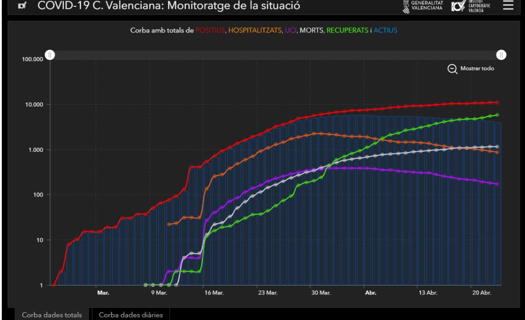 Actualment el nombre de casos registrats en la Comunitat Valenciana s’eleva a 11.123, encara que el total de casos actius en estos moments suma 3.918, 30 menys que ahir. D’aqueix total de positius hi ha 812 persones ingressades, 35 menys que ahir: 90 a Castelló, 194 a Alacant i 528 a València. El total de persones en UCI ascendeix a 160, deu menys que este divendres.