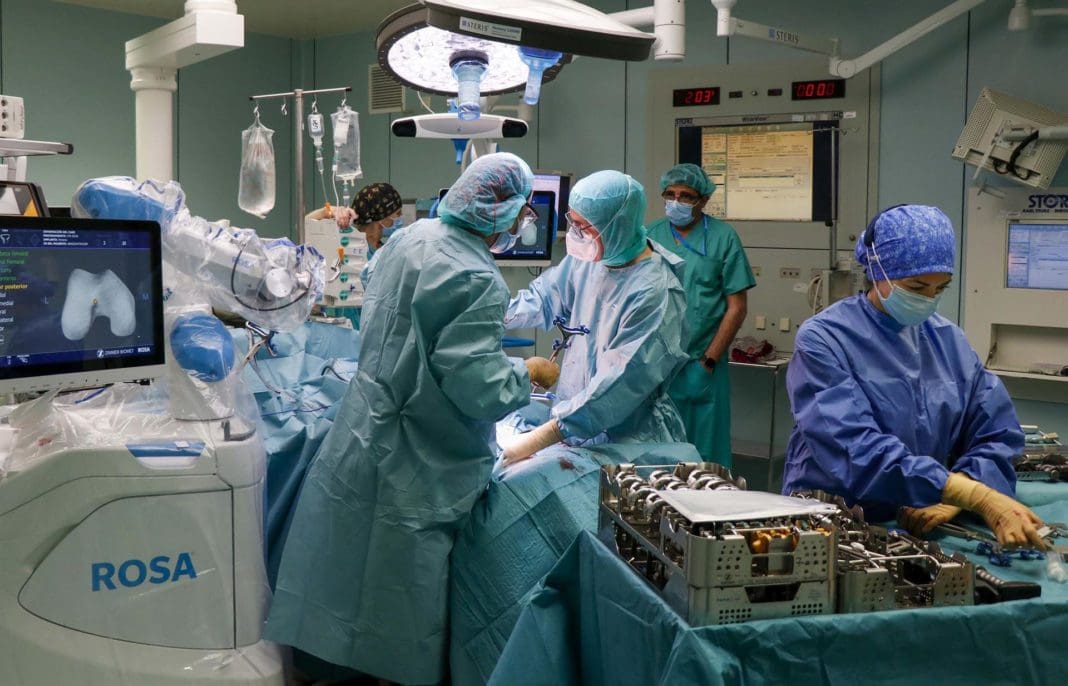 Ya en la mesa de operaciones, el cirujano cuenta con la asistencia de un brazo robótico o Robot Surgical Assistant (ROSA) que lo guía en tiempo real para que pueda realizar con una precisión milimétrica los cortes óseos óptimos para reemplazar el cartílago dañado por una prótesis biocompatible.