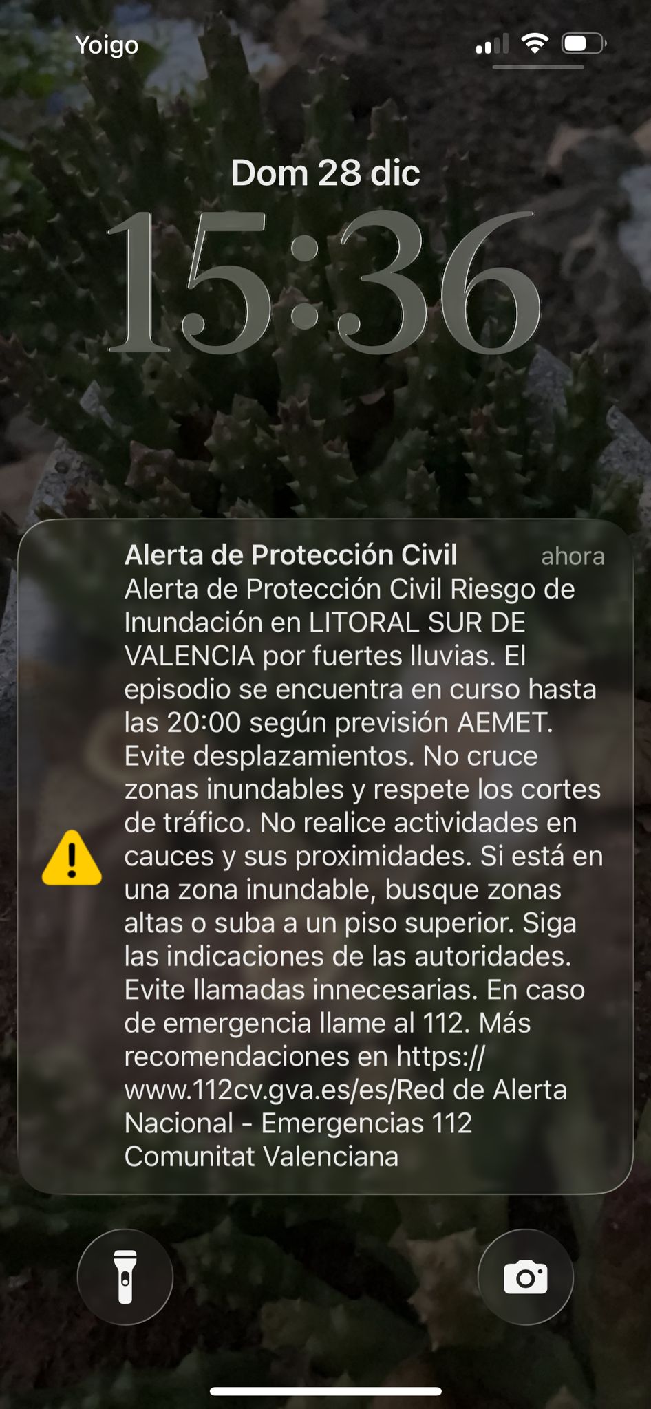 Los vecinos del litoral sur de Valencia (la zona en la que AEMET ha establecido el aviso rojo por lluvias) han recibido una alerta en sus teléfonos.