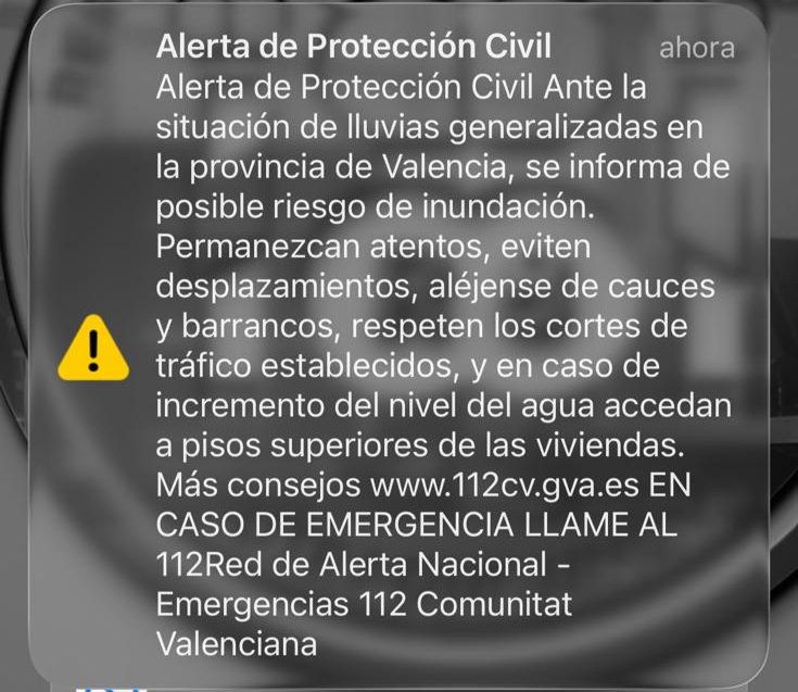 La Generalitat Valenciana ha enviado un segundo mensaje Es_Alert a los móviles de toda la provincia de Valencia para advertir del riesgo de inundaciones y pedir que no se invadan cauces ni barrancos y se eviten los desplazamientos.