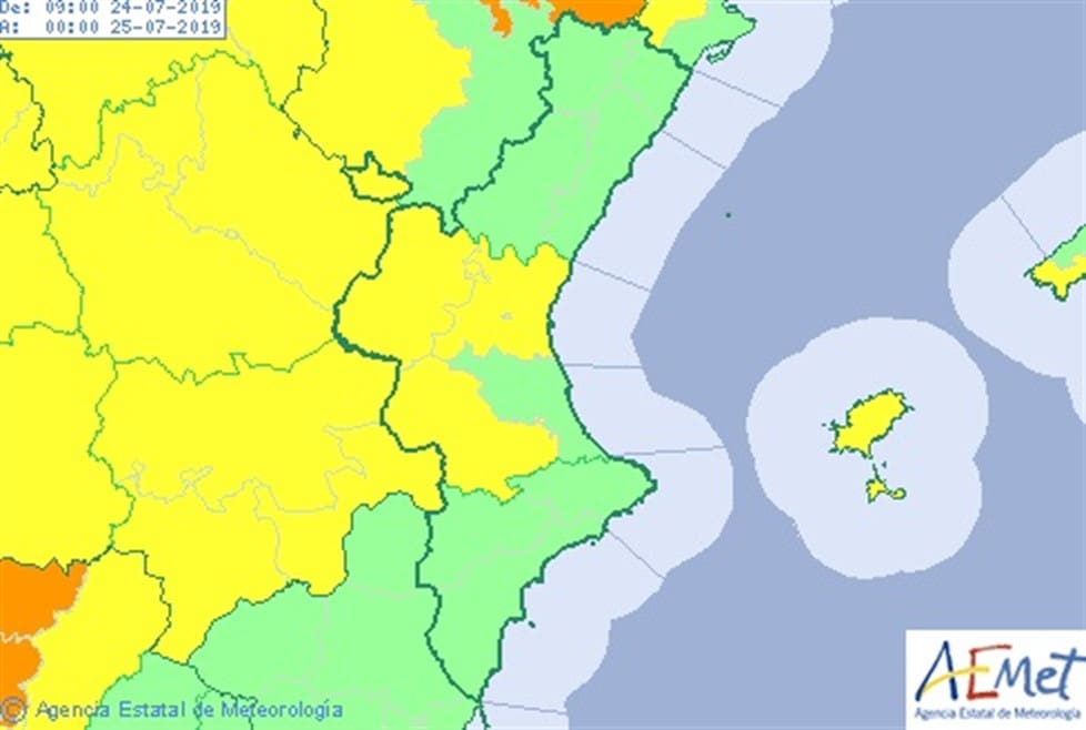 La província de València, excepte el litoral sud, està hui dimecres en avís groc per altes temperatures que poden arribar als 38 graus a l’interior i els 36 graus al litoral, segons la predicció de l’Aemet.
