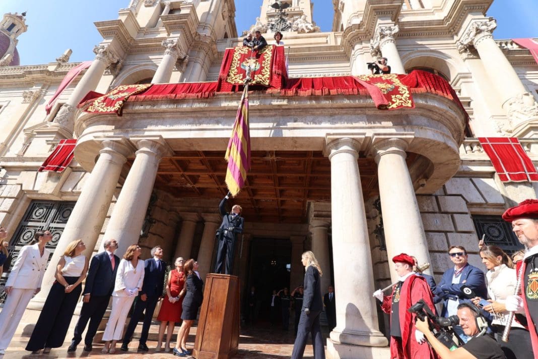 Desde las 12 del mediodía, la Real Senyera recorre las calles de Valencia con motivo de las celebraciones del 9 d’Octubre, el Día de la Comunitat Valenciana. Tras ser bajada por el balcón del Ayuntamiento, la Senyera encabeza la Procesión Cívica por el centro de la capital del Turia.